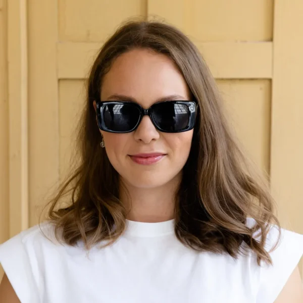 Trendikäs, matala aurinkolasimalli naisille.Musta kehys, linssin väri harmaa.100 % UV-suoja. Linssin Kat. 3.
